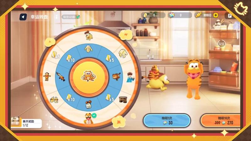 幸运转盘抽奖:玩家可以在游戏商城中使用糖果或棒棒糖参与幸运转盘抽奖,有机会获得加菲猫家族的限定皮肤和道具。