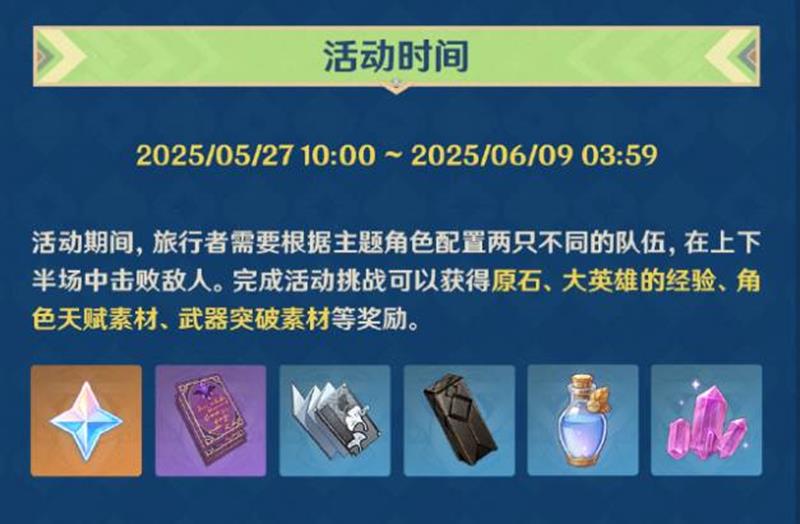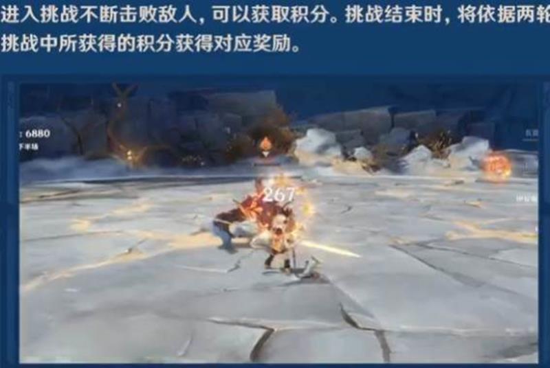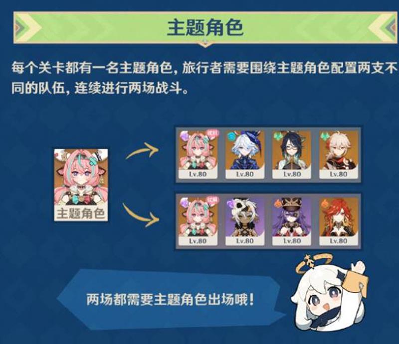 每个挑战分为上下两个半场,每个挑战都有一个主题角色。旅行者需要围绕主题角色配置两支不同的队伍,分别在两场战斗中击败不断出现的敌人,以获得更高的积分。挑战结束时,根据两轮战斗中所获得的积分,旅行者可以获得对应的奖励,包括原石、大英雄的经验、角色天赋素材、武器突破素材等。