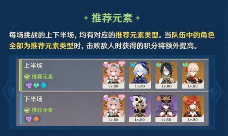 每场挑战的上下半场均有对应的推荐元素类型。当队伍中的角色全部为推荐元素类型时,击败敌人时获得的积分将额外提高。
