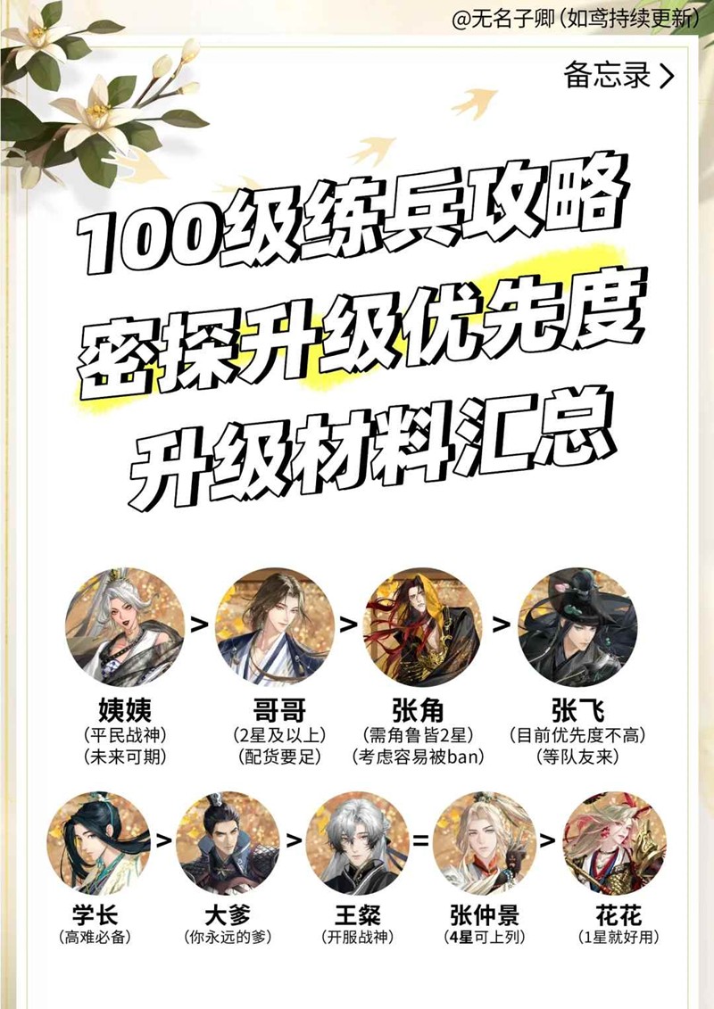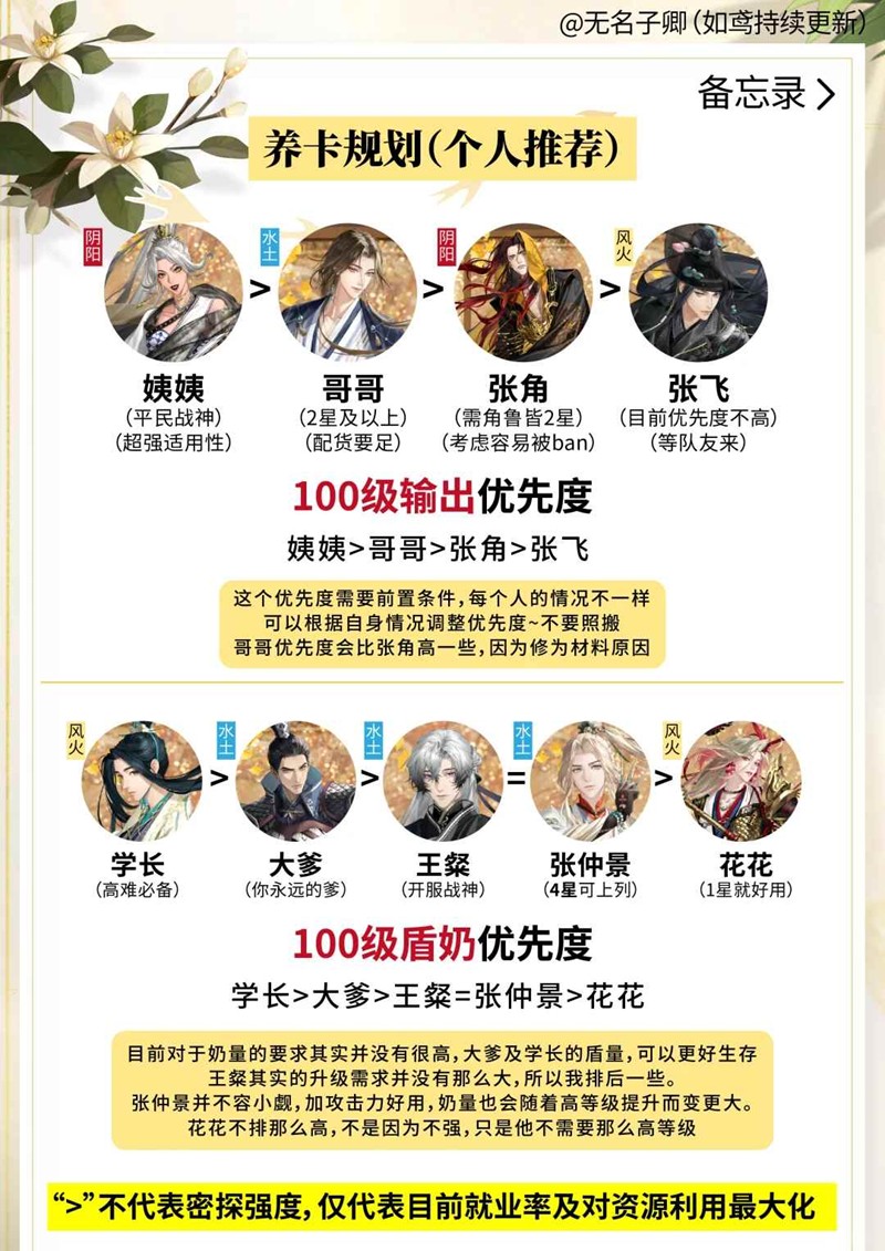 先练两个输出,推荐练姨姨先,因为姨姨的适配性更强然后张角跟哥哥可以根据卡关情况拉起来