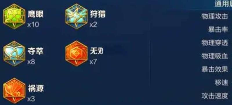 铭文搭配:祸源×10、鹰眼×10、狩猎×10