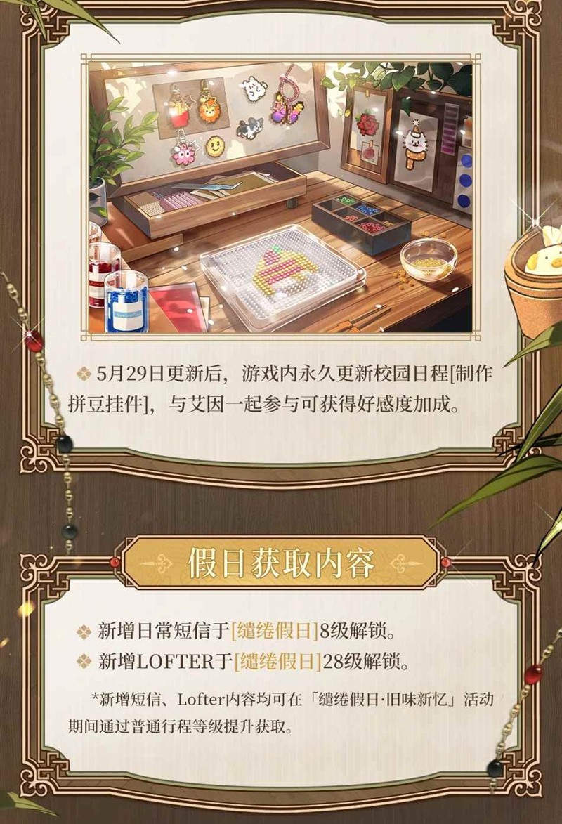 5月29日更新后,可体验全新校园日程[制作拼豆挂件],跟艾因一起参与可获得好感度加成。