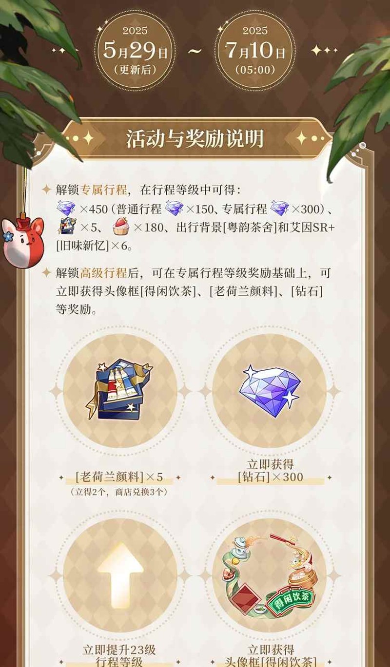 解锁[专属行程]或[高级行程]计划,可获得艾因SR+[旧味新忆]。活动详情请在活动开启后于游戏内查看。