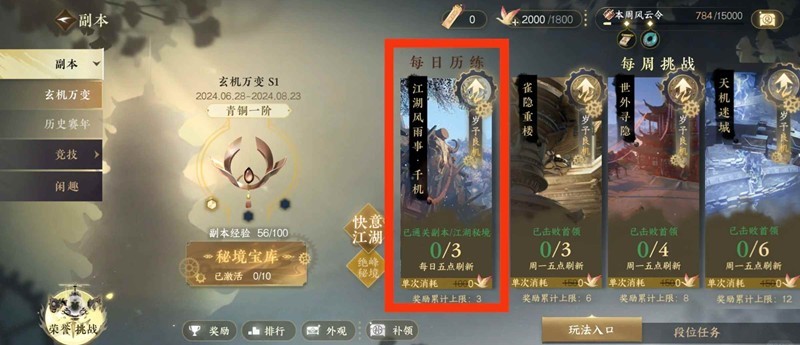 江湖风雨事(6人本),一天可以打一次,最多可以攒3天也就是3次一起打。这个副本没啥要求,等级够了就能打。