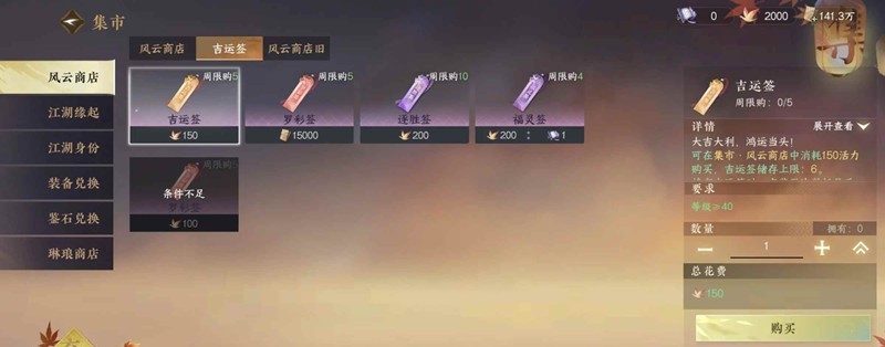 吉运签开出来的是装备,也会开出外观,但不多,一个BOSS只能用1次。就是你需要哪个装备就打哪个BOSS。不用每个都打(一周限购5个,最多攒6个)