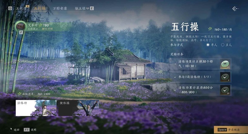 五行操:活络功+健体操(奖励上限2400艾草叶)音游玩法单人多人一样。实在不会直接六个位置一起点