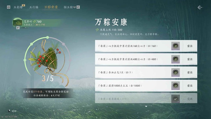 万棕安康:完成任意5个任务可拿全部奖励。驱五犊暂未开放。