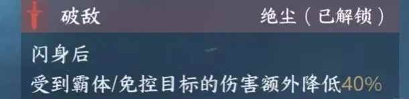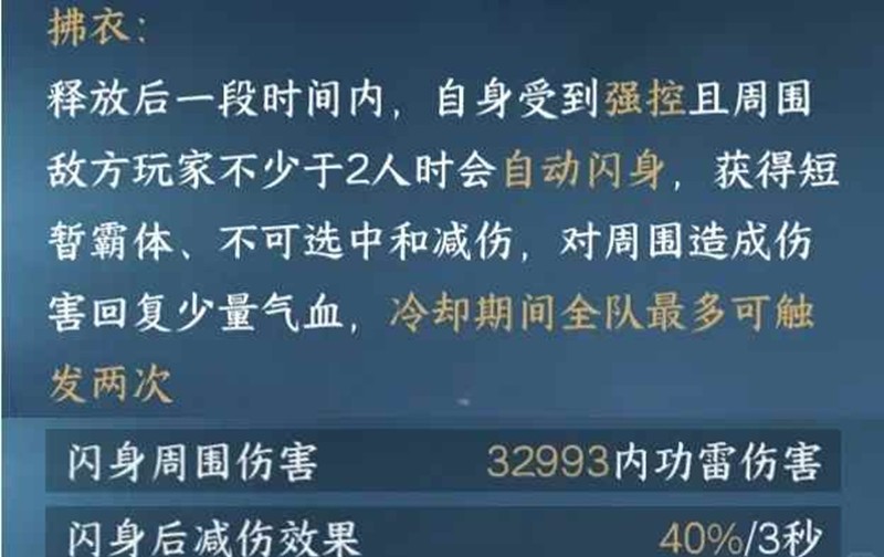 (3)pvp效果:释放后会进入自动闪避状态,周围有2名及以上敌方玩家时,自身受到控制会自动闪出去,获得霸体+不可选中+减伤,造成伤害和回复气血效果可以无视(数值太低),另外注意这个闪身是可以从血河腾龙框里出去的!闪避控制技能后,获得持续3秒的40%减伤效果,每个队伍在32秒内最多触发2次闪避(满阶是3次),保命还是挺不错的,伤害而言的话是不如【云影濯香】的。