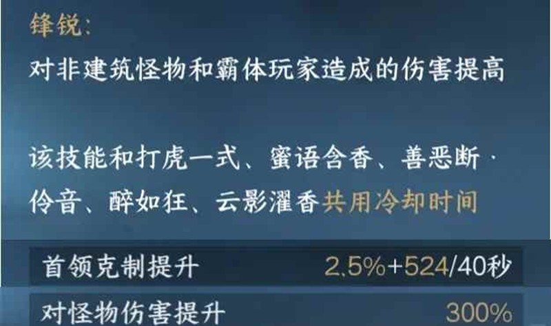 (4)pve效果:对怪物伤害提高,并且释放后获得持续40秒的首领克制增益效果,经过实测【流月无痕】技能伤害占比约为5.5%左右,首领克制可以视为全程覆盖约为2.5%收益,总收益低于满阶的【濯尘斩浪】和【潮倾浪野】,另外因为释放时间比较久,实战掉的秒伤还要更多一些。