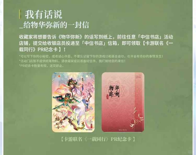 写下你想对《物华弥新》说的话,投递至收信处,还可获得【卡游联名《一载同行》PR纪念卡 】*1!