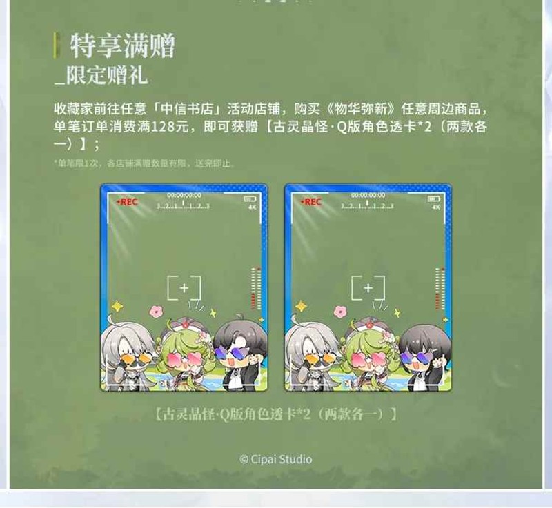 收藏家前往任意「中信书店」活动店铺,购买《物华弥新》任意周边商品,单笔订单消费满128元,即可获赠【古灵晶怪·Q版角色透卡*2】(两款各一)~