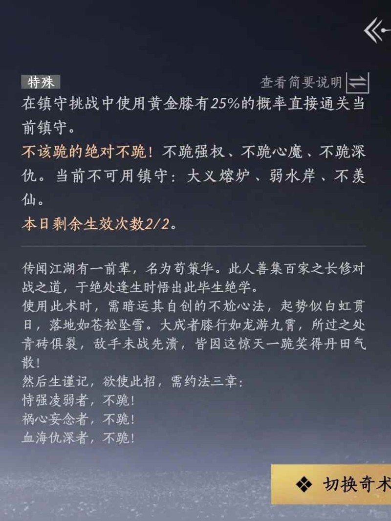 ①不要领奖励,黄金膝生效限制2次,不领就可以一直跪;