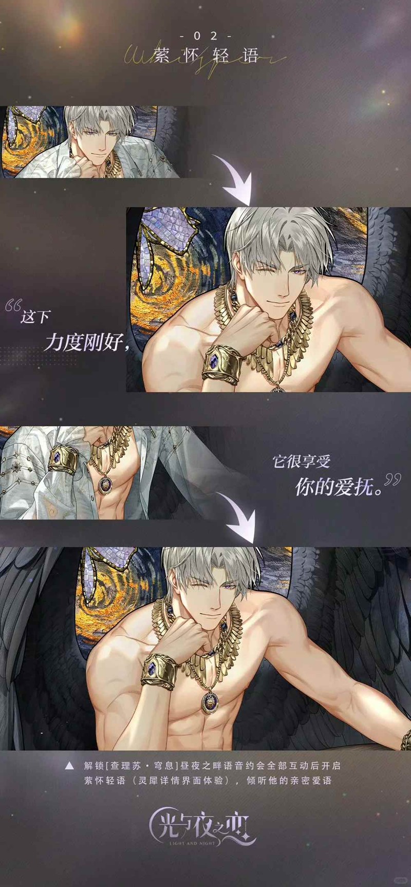 解锁[查理苏・穹息]昼夜之畔语音约会全部互动后可在【灵犀详情界面】开启专属系统【萦怀轻语】,鉴赏全画幅光影,倾听他的亲密爱语。