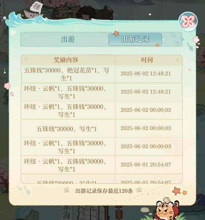 可以一次性出游多次,不需要5分钟上线一次,留音匣会保留,写生会保留,小剧情不会保留