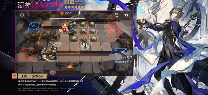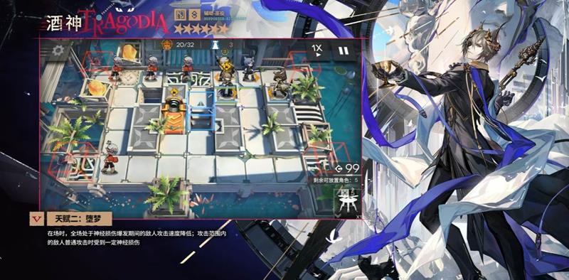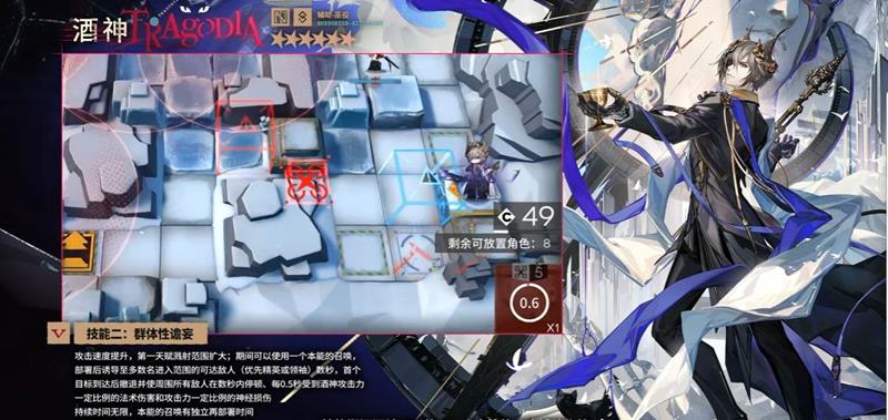 三技能:应对高压环境时可阻挡空中单位,生成提亚卡乌勇士,可在不可部署地块放置并阻挡敌人,技能期间酒神可造成大范围神经损伤。