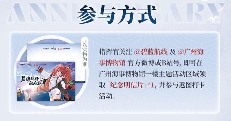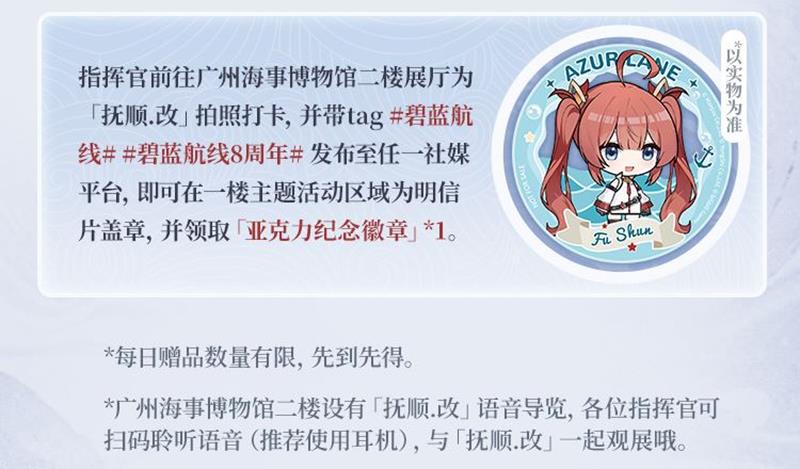 活动期间,指挥官们可关注 @碧蓝航线 及 @广州海事博物馆 官方微博或 B 站号,在广州海事博物馆一楼主题活动区域领取「纪念明信片」* 1,并参与返图打卡活动。此外,前往二楼展厅为「抚顺. 改」拍照打卡,并带 tag #碧蓝航线##碧蓝航线 8 周年# 发布至任一社媒平台,即可在一楼主题活动区域为明信片盖章,并领取「亚克力纪念徽章」* 1。不过,每日赠品数量有限,先到先得哦。