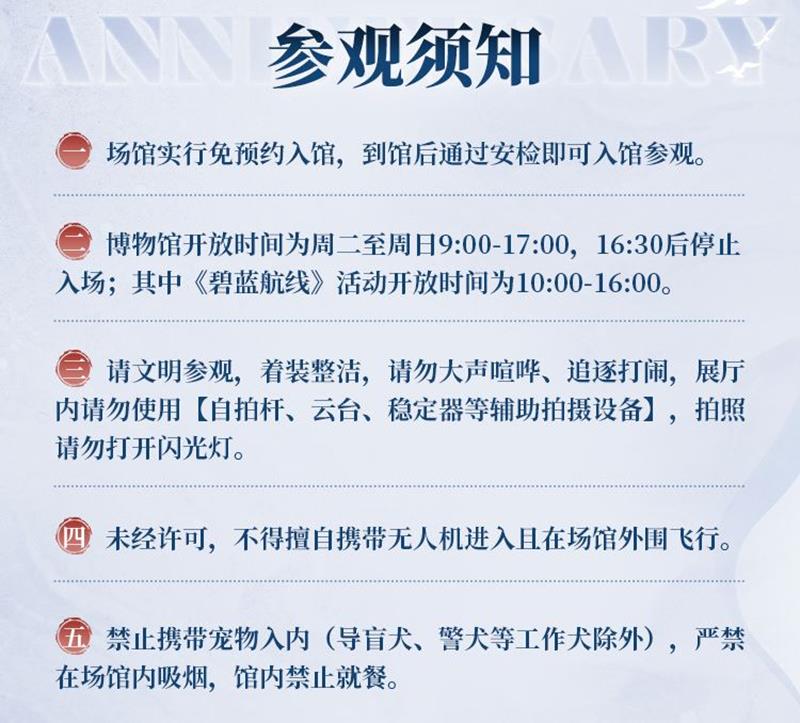 场馆实行免预约入馆,到馆后通过安检即可入馆参观。博物馆开放时间为周二至周日 9:00 - 17:00,16:30 后停止入场;其中《碧蓝航线》活动开放时间为 10:00 - 16:00。