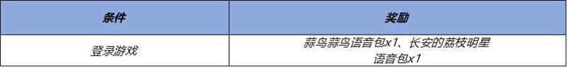 活动期间登录游戏即可领取蒜鸟蒜鸟语音包、长安的荔枝明星语音包!
