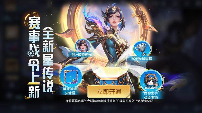 终极奖励——进阶战令即刻领取限免卡!全新星传说皮肤、夏冠战队签名、星传说按键、动态表情等丰厚奖励,进阶战令升至80级全部带走。