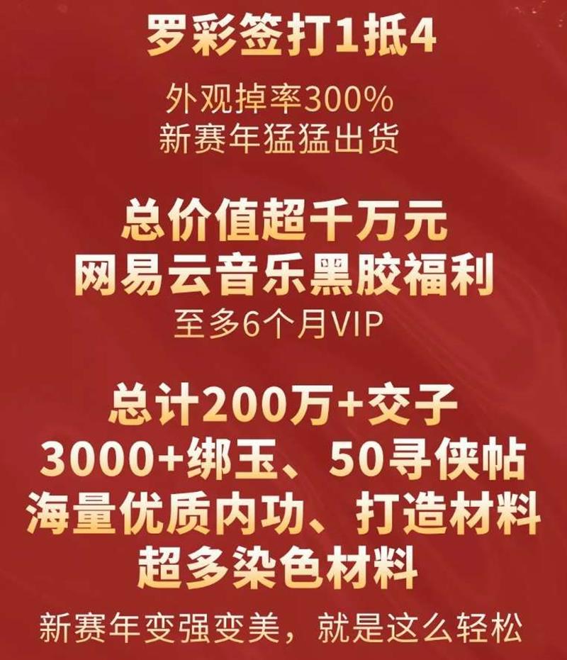 打一抵四活动:6月30日至7月28日期间,罗彩签刷1抵3,外观掉率加成300%。