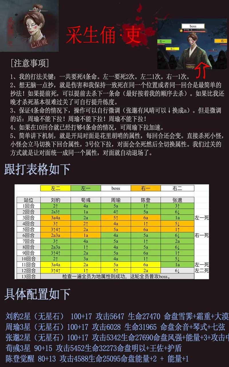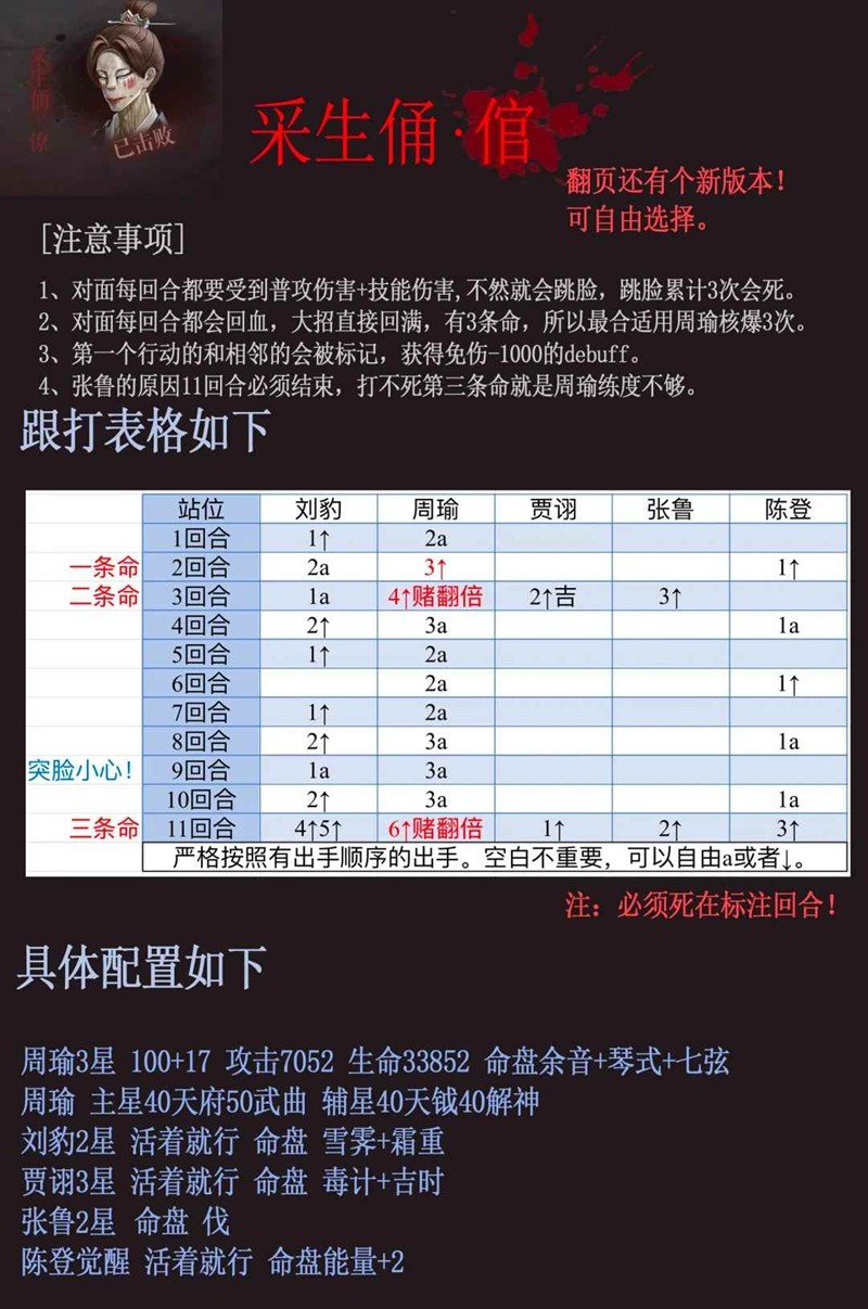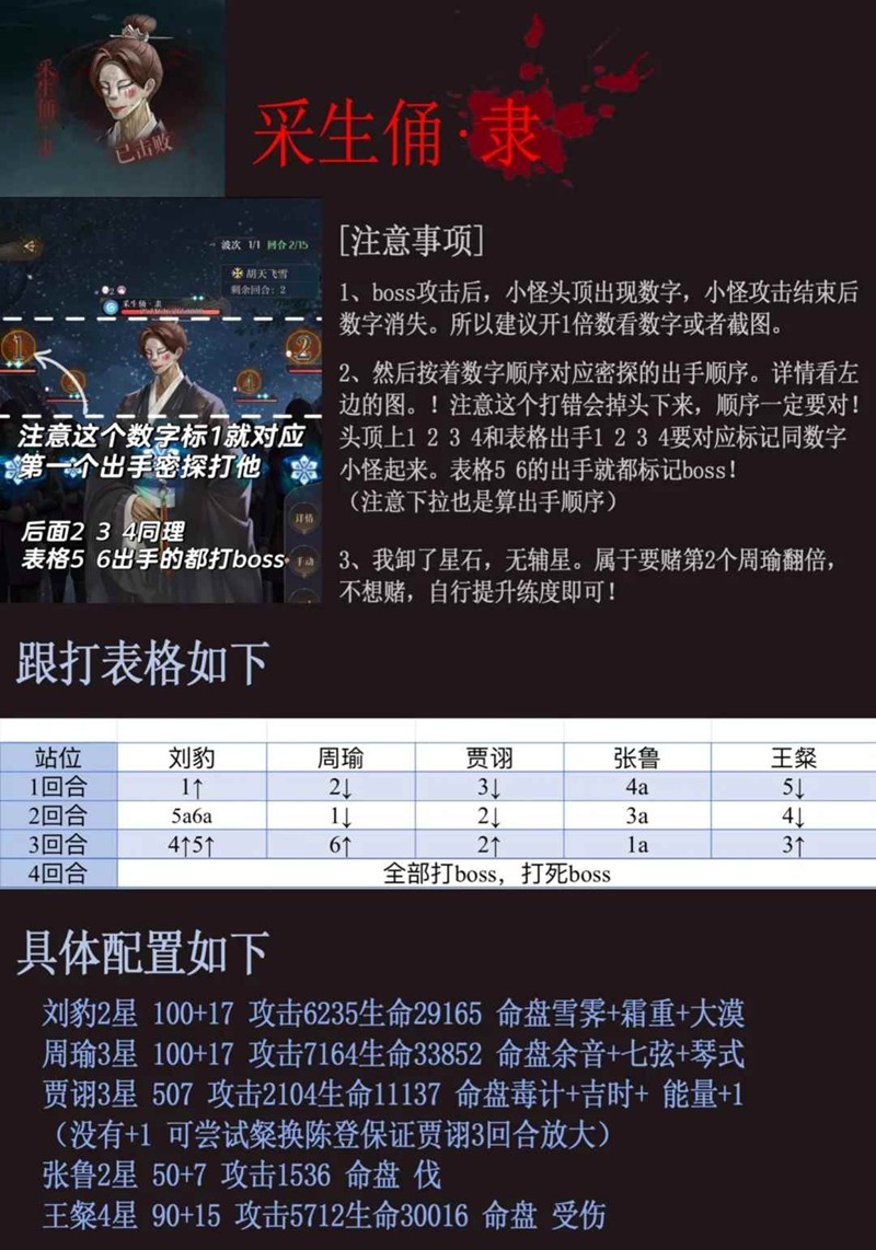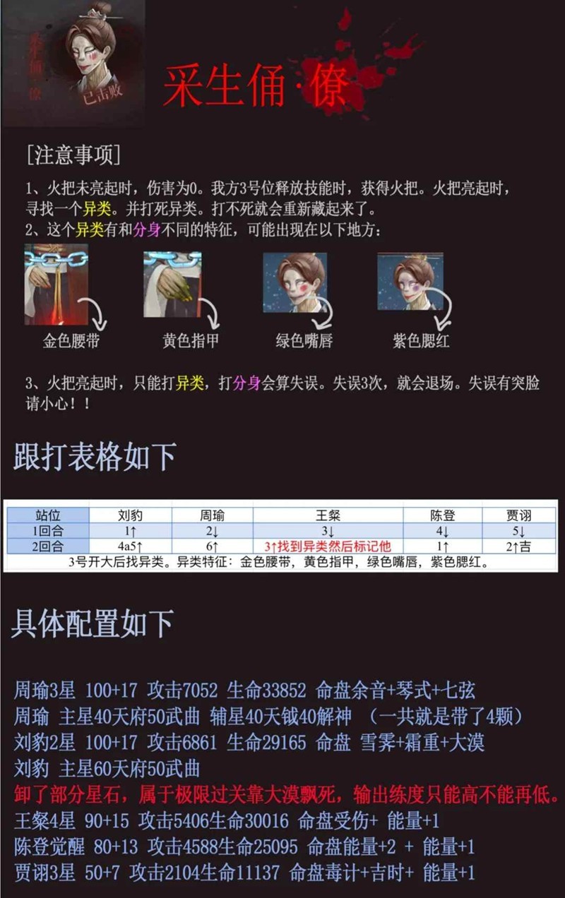如果刘豹命盘和伤害非常优秀,也可以考虑4↑一个分身5↑异类,伤害会更高。(小心突脸)