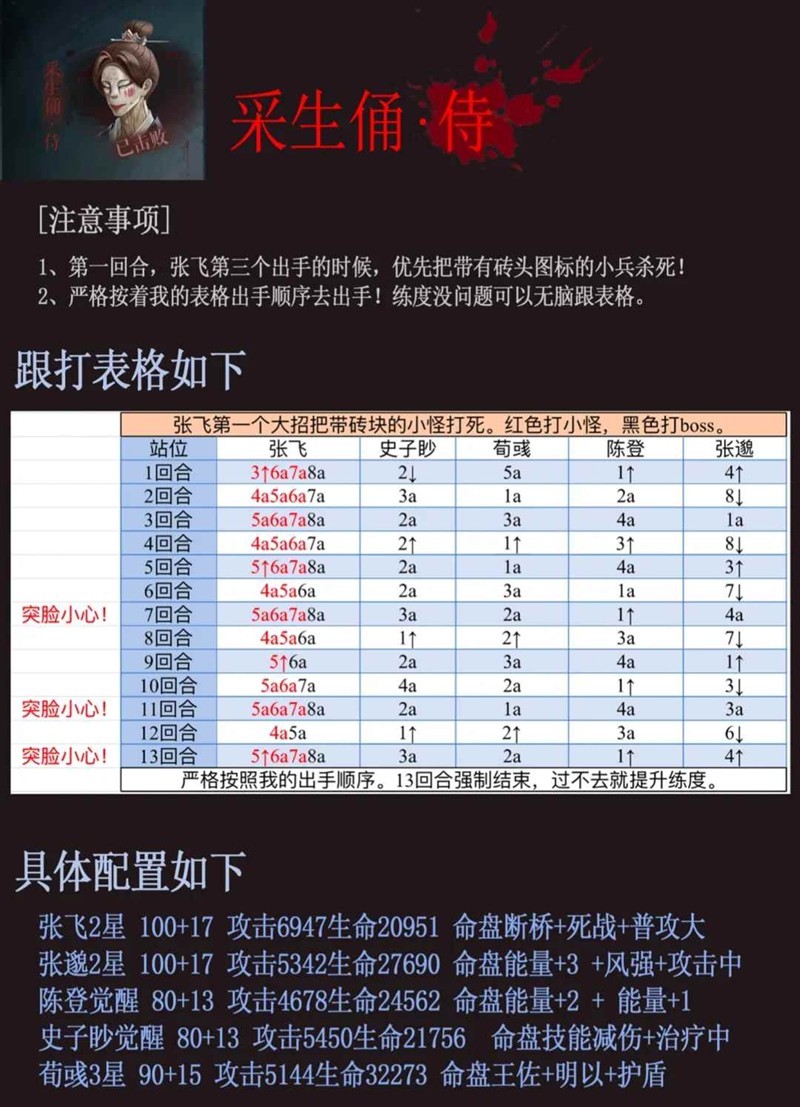 注意:砖头一开始在boss身上,然后等按着表格操作完,砖头在小兵身上后,张飞按表格优先把带砖头的小兵处理掉。