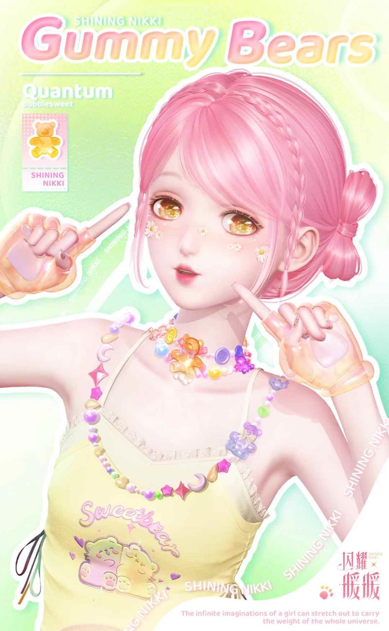 活动期间,参与限时感应及限时累充等任务,收集「小熊软糖」,即可解锁对应拼图,兑换非凡服饰【宇宙泡泡熊】【量子泡泡蜜】、穿搭模板【幻景畅游】、贴纸模板【熊熊乐园】、动作【远空呼唤】【祈望流光】及粉钻等丰厚奖励。