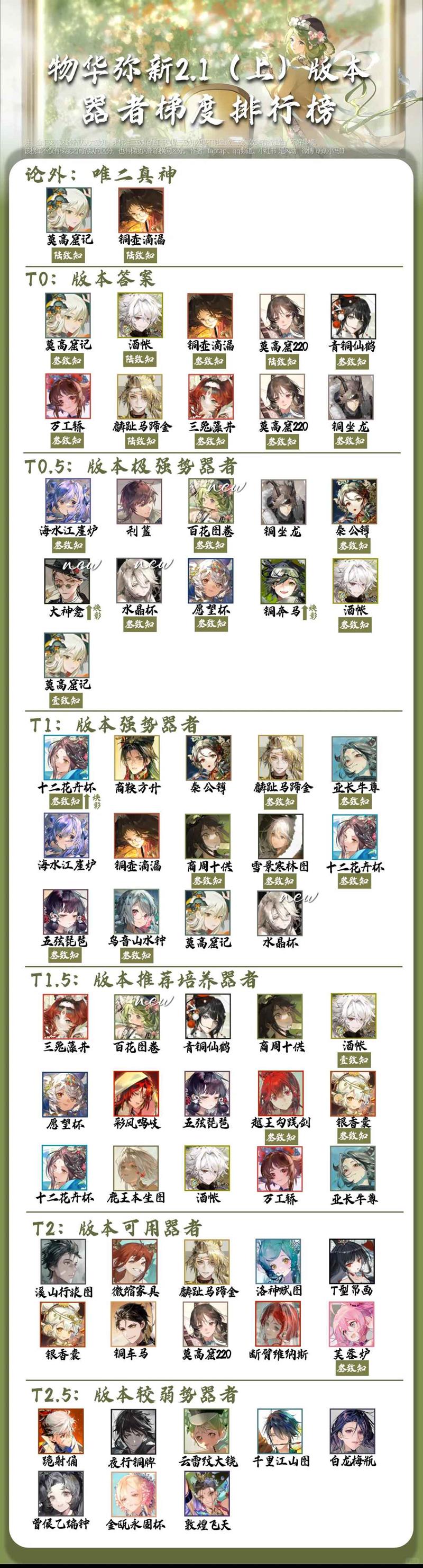 利簋:由于莫高窟记的神力,使利簋已经成为速通队的刚需角色。并且新武器的出现使酒帐能够超速利簋,让酒帐在不用吃到对面伤害的时候就能够解锁六致的再动,使酒帐手感变得非常好。(原本上个梯度榜已经在t0.5了但是我忘记改了,不好意思!)