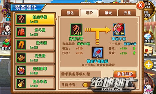 当装备达到当前品质满级时,玩家可以进行装备进阶,提升装备品质。进阶后的装备不但属性会大幅提升,可强化等级也会增加。装备进阶需要玩家收集指定的道具材料“进阶图纸”。