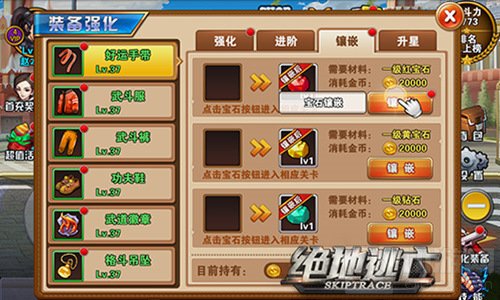 每件装备都有三个宝石孔,每个宝石孔只能镶嵌指定的宝石,当装备镶嵌宝石后可提升装备属性。宝石还有等级之分,玩家可以通过消耗游戏金币对宝石进行升级,宝石的等级越高,对装备的属性加成也越高。