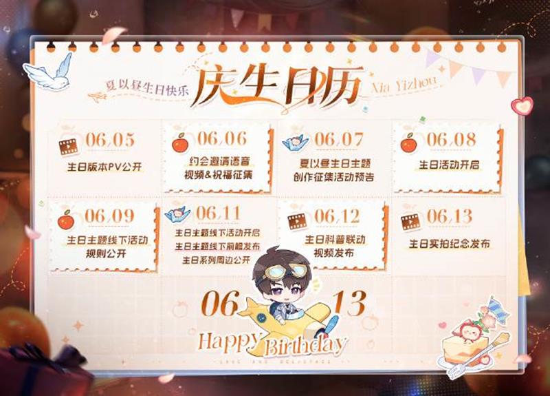 参与活动可体验专属剧情,与夏以昼共度只有彼此的生日。完成活动任务可获得生日限定思念、日常服装、拍照动作、「深空许愿券·限时*20」等丰富奖励。6月8日至6月15日期间登录游戏,可在邮箱内免费领取「深空许愿券·限时*10」。6月13日0:00至6月15日4:59,记得接听来自夏以昼的生日「视频电话」。