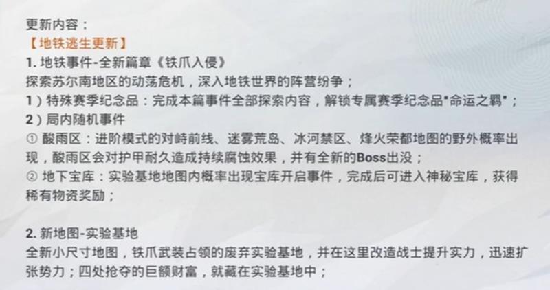 地铁逃生模式的本次更新为特种兵们带来了全新的地图、玩法和系统优化,无论是新地图的探索,还是新玩法的挑战,都将为玩家带来全新的游戏体验。特种兵们可以前往体验服抢先体验这些新内容,感受地铁逃生模式的魅力!