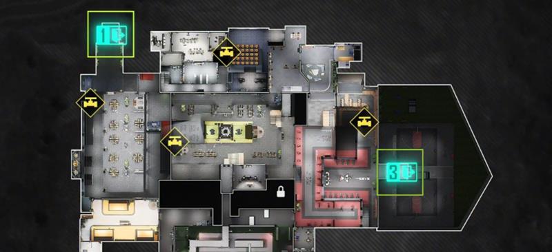 地图设有西北、东南和中央偏下三个撤离点。玩家可以根据出生位置选择不同进攻路线。常见路线是从入口大厅直取会议区保险箱,随后攻占办公区总裁室,最后向西北撤离点推进。另一条稳妥路线则是经战术区收集镭钻补给后,转战健身餐饮区,最终从东南方向撤离。