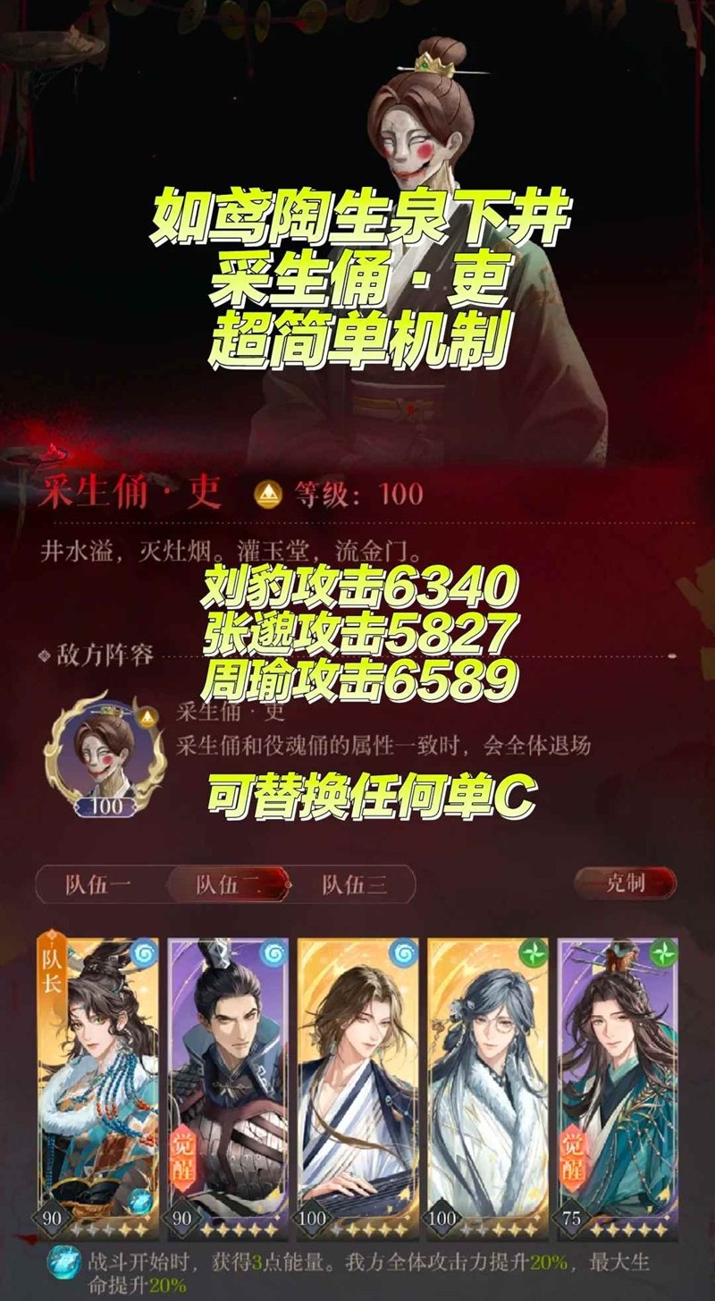 如鸢是一款基于汉末历史背景的架空改编的手游。在游戏中,玩家是女扮男装的“广陵王”,作为密探组织“绣衣楼”的首领,在推进主线剧情的过程中与文曲尉、太仆、孙氏少主等主角产生不同的情感羁绊。那么如鸢陶生泉下井采生俑·吏应该怎么打呢?小编为你准备了一份攻略,一起来看看吧~