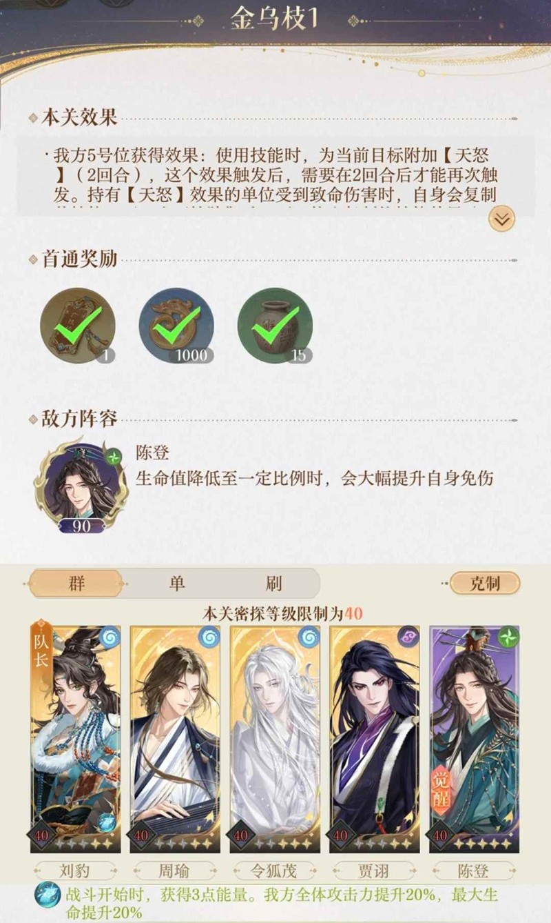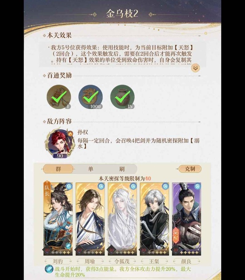 遗迹四:这关又叫“对自己的密探伤害有点数”关。一句话解释,要边控血边击杀张飞的六条命。张飞半血以下打人变痛,大招后一回合半血一下打人狂痛,要么直接打死,要么不打。控血控成s……呵呵。不要用伤害不稳定的密探,很赌。