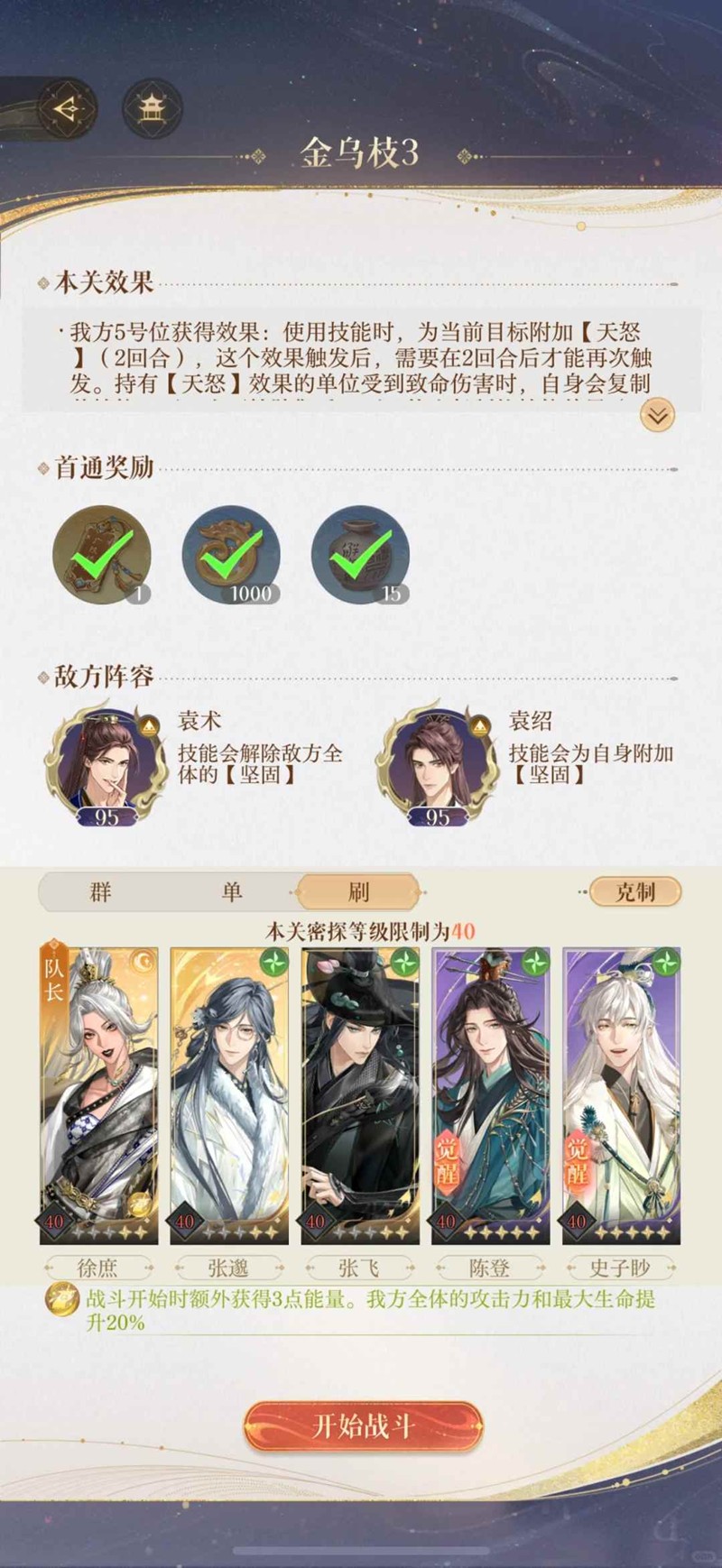 遗迹三:密探选择:带一个群攻和一个单体。这关开始要复制boss技能了,【遗迹四和遗迹五同理,五号位的密探对boss放完技能的两回合内击败boss,就能复制boss技能,防御即可释放。】五号位要复制两种技能,首先,袁绍放完大招会开始无敌,要在此之前复制【袁术】的技能,对着无敌的袁绍释放技能解除其无敌状态。其次,袁绍死之前要复制【袁绍】的技能,对着复活后强化的袁绍释放获得免伤。