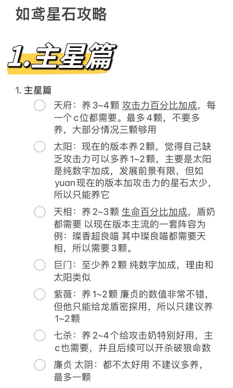 -天相:养2~3颗 生命百分比加成,盾奶都需要 以现在版本主流的一套阵容为例:璨香超良喵 其中璨良喵都需要天相,所以需要3颗。