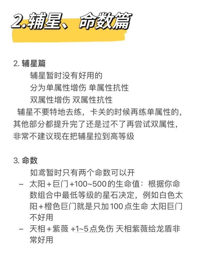 辅星不要特地去练,卡关的时候再练单属性的,其他部分都提升完了还是过不了再尝试双属性,非常不建议现在把辅星拉到高等级
