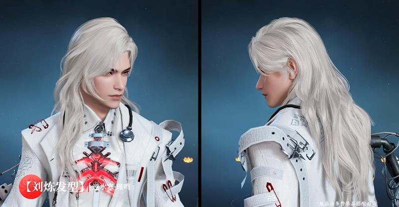 刘炼极品外观【逆水寒·雕骨琢心】:捆绑包原价2550元宝,现价1440元宝,包含时装、发型、挂饰及刘炼表情动作。银色长发搭配单片镜,展现出神秘而优雅的气质。