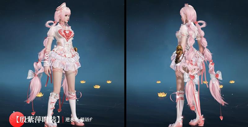 殷紫萍极品外观【逆水寒·温语愈心】:捆绑包原价2550元宝,现价1440元宝,包含时装、发型、挂饰及殷紫萍表情动作。少女身着奶白色纱裙,搭配双爱心辫和宝石发卡,整体造型甜美可爱。