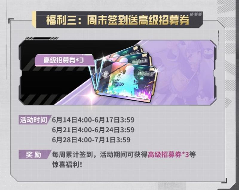 周末签到送高级招募券:6月14日至6月17日、6月21日至6月24日、6月28日至7月1日,每周累计签到可获得高级招募券*3等福利。