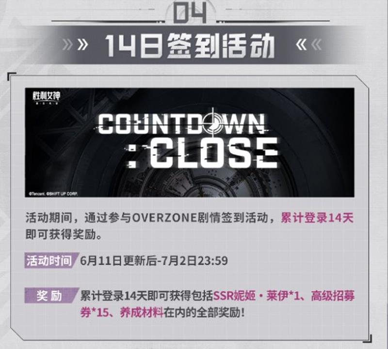 14日签到活动:6月11日更新后至7月2日,累计登录14天可获得SSR妮姬·莱伊*1、高级招募券*15、养成材料等全部奖励。