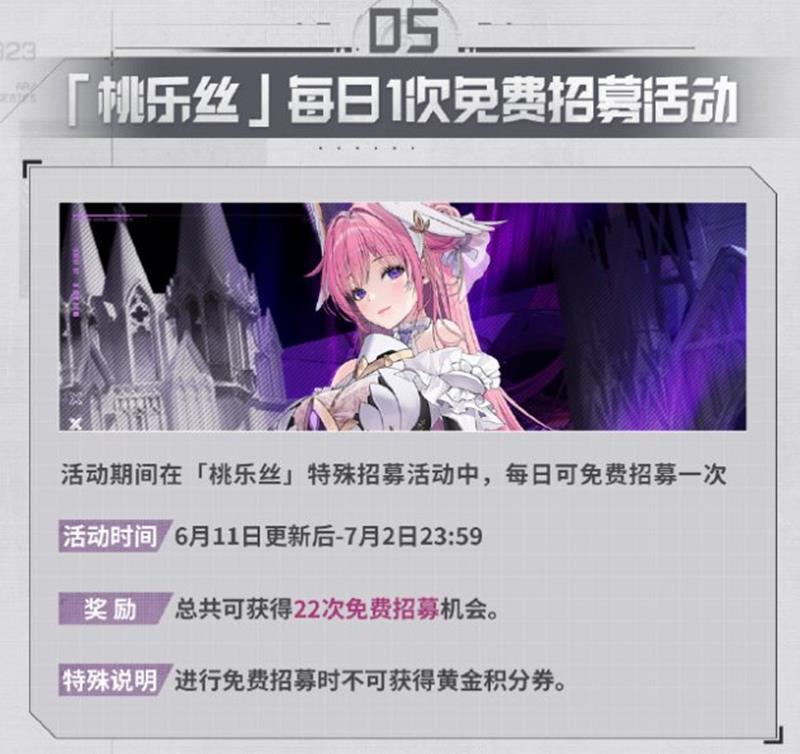 桃乐丝每日免费招募:6月11日更新后至7月2日,每日可在桃乐丝特殊招募中免费招募一次,总共可获得22次免费招募机会。