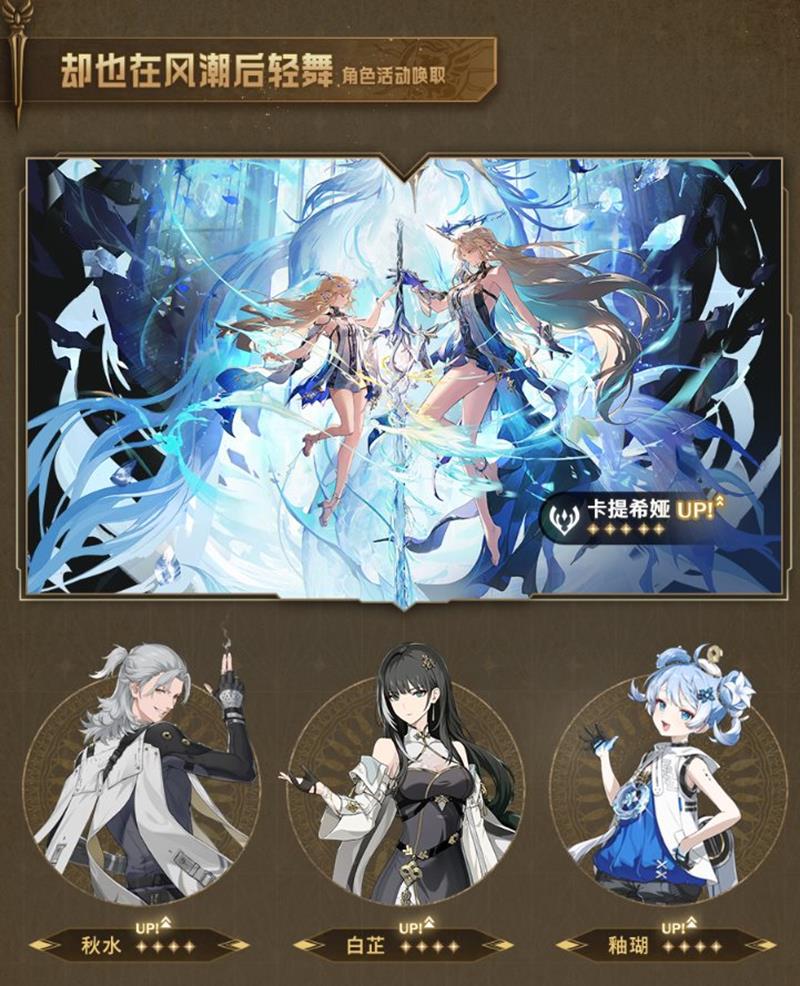 上半卡池:新角色「卡提希娅」登场,她是周年庆的主打角色,拥有风蚀属性和双形态切换能力,大招效果极具视觉冲击力。