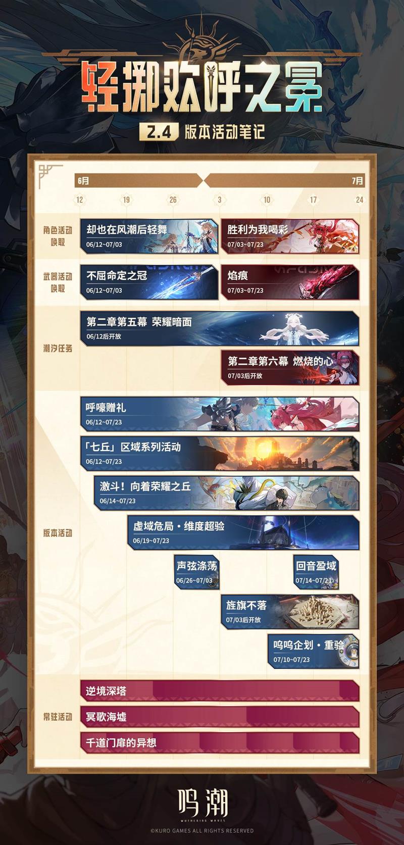 鸣潮2.4版本“轻掷欢呼之冕”将于2025年6月12日正式上线。本次版本更新将带来丰富的新内容,包括新角色、新地图、新任务以及全新福利活动。官方也在今日发布了新版本的日程,我们来一起看看吧~