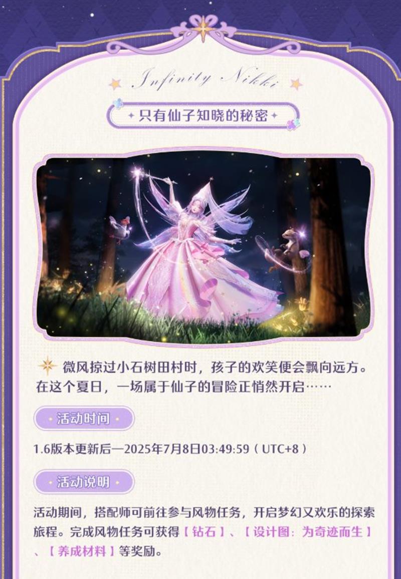 「只有仙子知晓的秘密」风物任务活动期间,搭配师可前往参与风物任务,开启一段梦幻又欢乐的探索旅程。