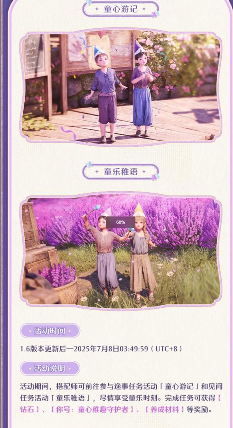 「天真时刻」逸事见闻任务搭配师可参与本次活动的「童心游记」和「童乐稚语」,尽情享受童乐时刻。