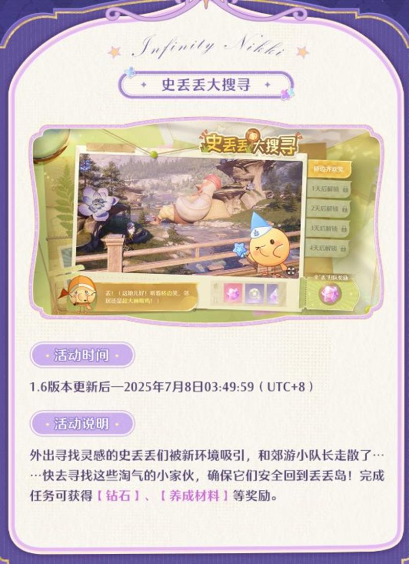 「史丢丢大搜寻」限时收集外出寻找灵感的史丢丢们被新环境吸引,和郊游小队长走散了……快去寻找这些淘气的小家伙,确保它们安全回到丢丢岛,即可获得丰厚奖励!