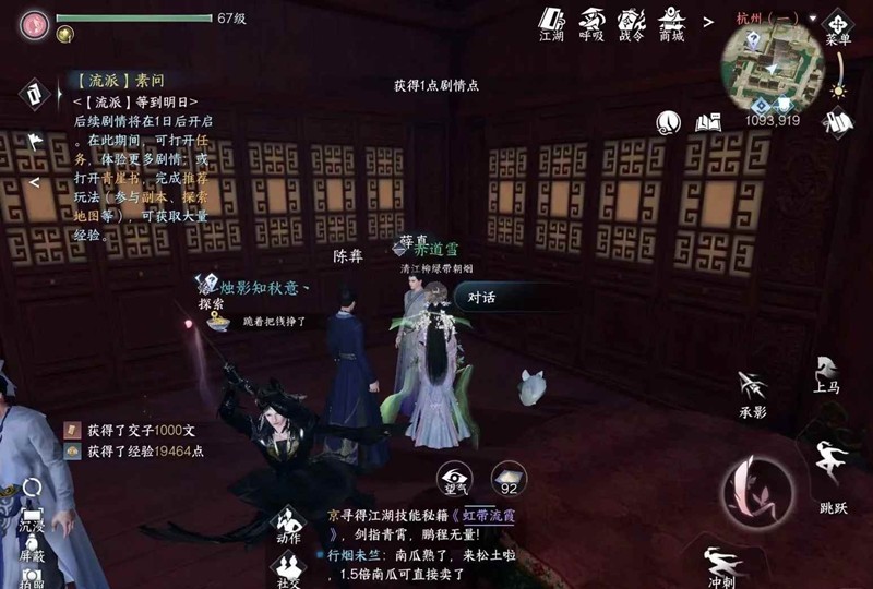 再去杭州(1278-833)对话蓝实,拿到信物后前往(1102-898)的桥上找到桂枝,提交下品止血散(可以在商城-集市-江湖身份里购买)