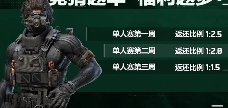 随着赛事的推进,竞猜币的返还比例会有所变化,例如单人赛第一周的返还比例为1:2.5,第三周则为1:1.5。
